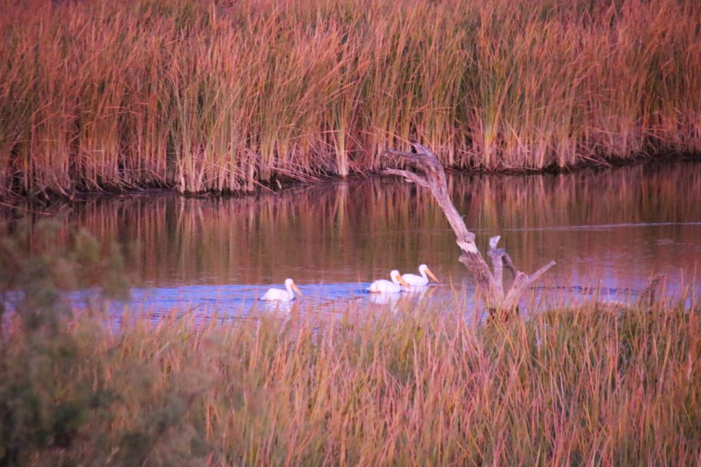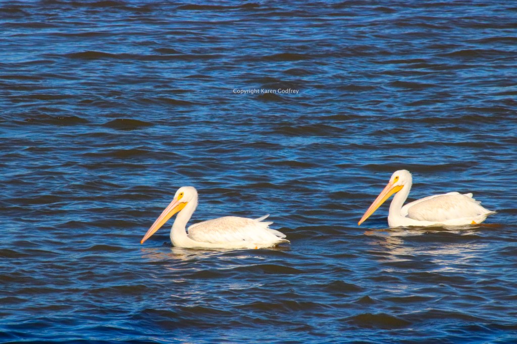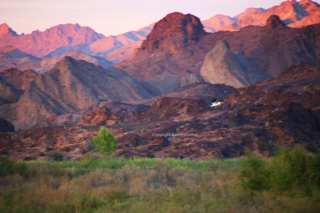 Pelicans have been appearing in unexpected places. I was surprised to see them swimming at Starved Rock State Park in Illinois last September, on the first night of our two month trip out West. Later on in our journey, I was even more surprised to find them out in the desert, among the chocolate and burnt Sienna mountains in Picacho Recreation Area in Southern California.