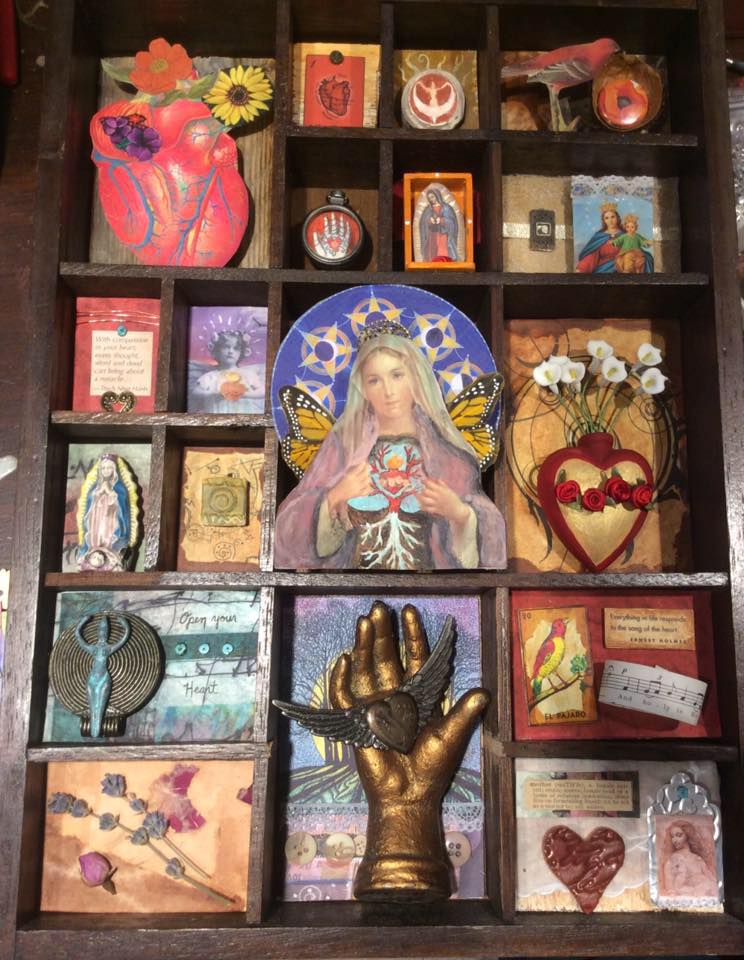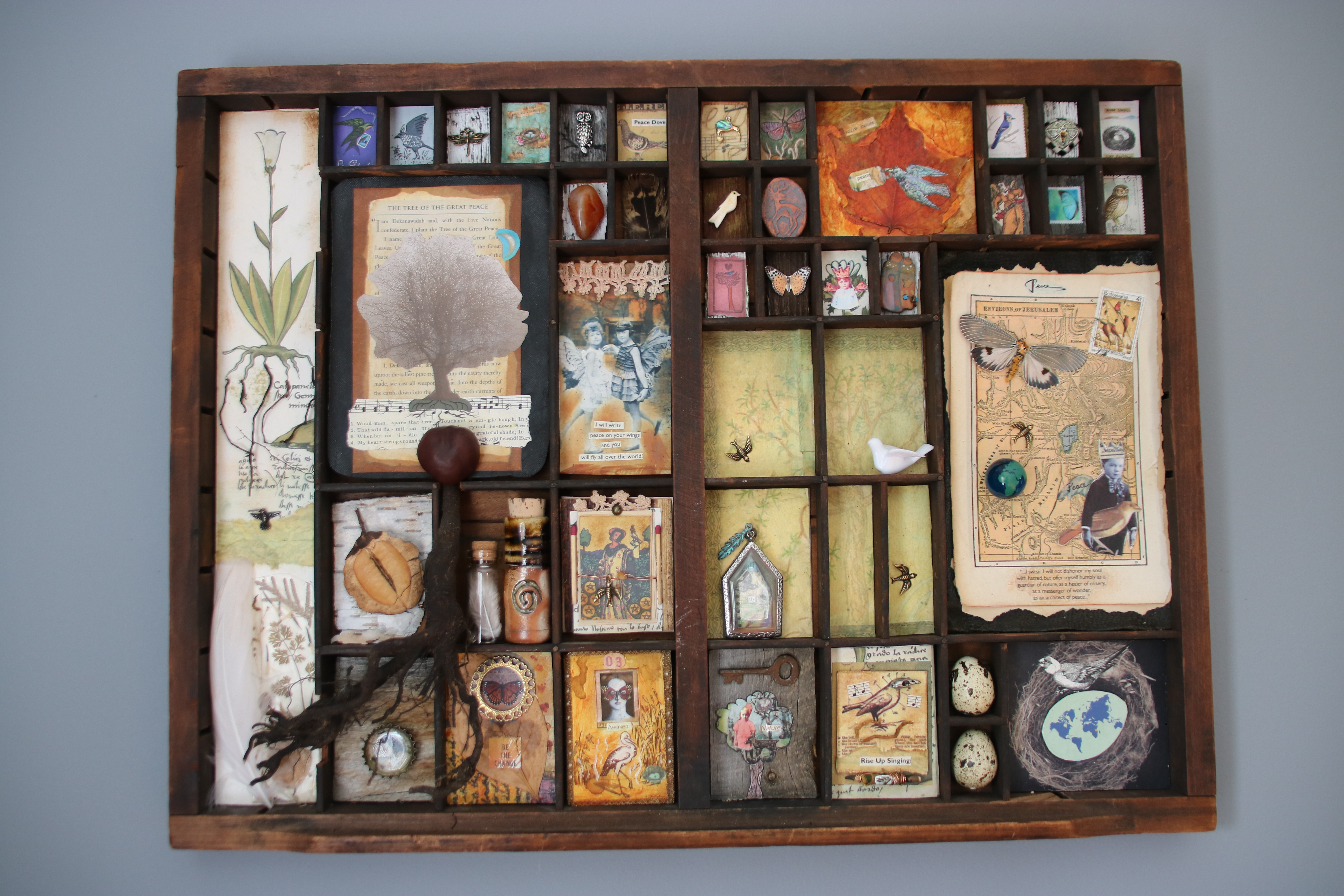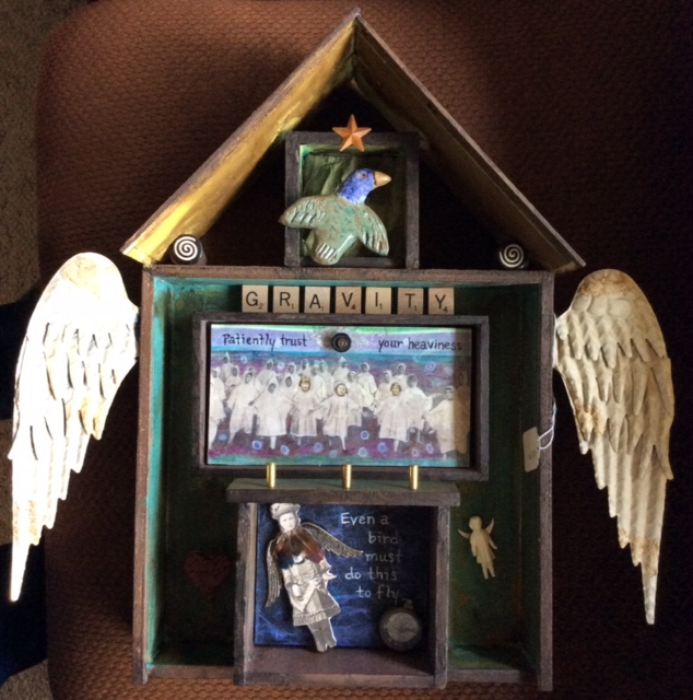 This assemblage is inspired by Rainer Maria Rilke’s poem that begins with: “How surely gravity’s law, strong as an ocean current, takes hold of the smallest thing and pulls it toward the heart of the world . . . . Patiently to trust our heaviness. Even a bird has to do that before he can fly.”